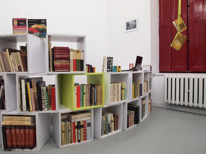 To zjawiskowe wnętrze stworzyła para architektów z pracowni Hokum Architekci: Agata Maciejewska (znana też jako blogerka Agatiszka) i Jan Katyszewski. Wnętrze podzielono na dwie strefy: pierwszą zdominowała biel będąca naturalnym tłem dla, najważniejszych w tym pomieszczeniu, książek. Umieszczono je na dość nietypowych i oryginalnych regałach: ich rolę pełnią niewielkie, ustawione w rzędach sześciany (wykorzystane również jako lada). Kolejne pomieszczenie zaaranżowano na czytelnię. Tutaj limonkowa podłoga delikatnie kontrastuje się z bielą ścian i… sześcianów, tym razem wykorzystanych jako wygodne siedziska, przykryte zielonymi poduchami. Z góry zwisają książki zawieszone na wstążkach (!).
