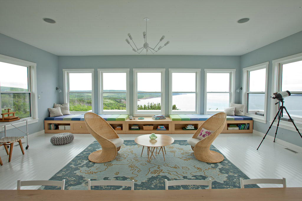 Pamiętacie posta z ruinami wkomponowanymi w nowoczesny dom stojący na zupełnym odludziu, na Isle of Coll? Tym razem to nie stara poczciwa Szkocja będzie bohaterką tego wpisu, ale jej transatlantycka siostra – Nowa Szkocja znajdująca się w dzisiejszej Kanadzie. Tak jak to zwykle bywa, właściciele tej okazałej willi, Eliot i Alexandra Angle z Los Angeles, zakochali się początkowo w wietrznej i deszczowej wyspie Cape Breton, potem postanowili wrócić tu na dobre i wybudować dom do złudzenia przypominający tamtejsze wiekowe stodoły. Drewno – ten najbardziej ekologiczny z dostępnych materiałów – okazał się najwłaściwszy do skonstruowania idealnego, rodzinnego i przytulnego gniazdka. Znajdziecie je (drewno, nie gniazdko) wszędzie: na tarasie wychodzącym na Zatokę Św. Wawrzyńca, w ogromnym salonie połączonym z jasną kuchnią (długi stół zaprojektowała osobiście Pani Domu), w minimalistycznej łazience z niewielką wanną. Gdzieniegdzie rozpoznacie ratanowe meble zatopione w jasnym, pastelowym wnętrzu, wełniany puf, kilka bibelotów z przeszłością i oryginalne krzesło zaprojektowane z okazji narodzin właściciela tego domu w 1969 roku. Przyznaję, że nie o wnętrze jednak chodzi mi tu najbardziej, ale o widok jaki – wybaczcie kolokwializm – zafundowali sobie Eliot i Alexandra. Z salonu swojego domu mogą podziwiać jednocześnie zatokę, zalesione wybrzeże i tamtejszy park narodowy (zdjęcie n’3 !). Dzięki temu, że dom wybudowano na wzniesieniu nie muszą też martwić się o wścibskich sąsiadów, ani nieproszonych gości. Oaza spokoju, chociaż nie wiem czy nie nazbyt melancholijna.