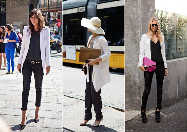Pozornie nie tak łatwo znaleźć białe (lub kremowe) marynarki na blogach z modą uliczną. O ile blogerki, które pokazują własne stylizacje są bardziej prężne i z chęcią prezentują się w jasnych kurtkach {1, 2, 3, 4}, o tyle w przemyśle modowym dominuje jej zupełne przeciwieństwo – czerń. Może to ze względów praktycznych? Biel niestety nie należy do najprostszych w utrzymaniu. Poniżej kilka zdjęć, które udało mi się wyszukać w czeluści internetu i trzy zestawy z białymi marynarkami w różnym stylu. Osobiście wybieram ten w wersji czarno – białej z nieśmiertelnym klasykiem od Calvina Kleina. To pozornie banalne połączenie sprawdza się zawsze, a inspiracją do jego stworzenia była stylizacja Kate Moss. Jak Wam się podoba?