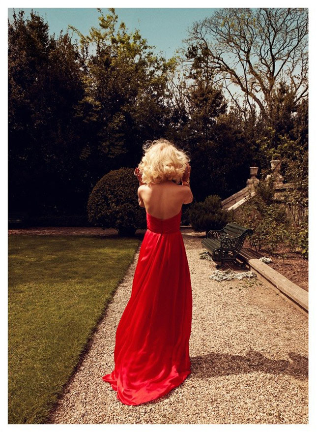 Dokładnie taka sama jest ta sesja, gdzie czerwień gra pierwsze skrzypce. W wersji total look, silnie kontrastująca z bujną blond grzywą modelki.