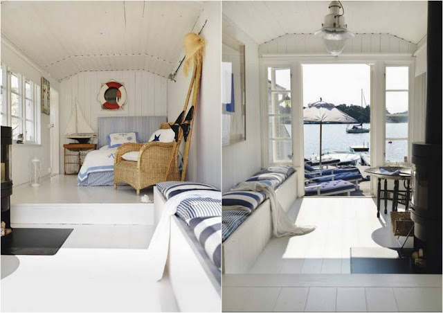 Wakacje nad jeziorem/morzem lub jakimkolwiek innym akwenem wodnym to jedyny sposób w jaki jestem w stanie przetrwać gorące lato. Z tego co słyszałam w Polsce nie dzieje się najlepiej w kwestiach pogody, ale tu gdzie jestem, czyli na południu Europy, gorące powietrze daje o sobie znać. Jedyne co mi pozostaje to „ochłodzić” się, przynajmniej wirtualnie, patrząc na poniższe zdjęcia i pomarzyć o polskich jeziorach. Ten niewielki biały domek znajduje się kilkadziesiąt kilometrów od Sztokholmu, w miejscowości Dalarö. Jest na tyle mały, że pierwsi właściciele z łatwością mogli wybudować go na skraju skarpy i połączyć z obszernym pomostem nad brzegiem zatoki. Składa się on właściwie z dwóch części: położonej wyżej, utrzymanej w stylu sielankowego pensjonatu z początku XX wieku (istotnie dom wybudowano w tym okresie), z wiklinowymi i drewnianymi meblami, oraz tej znajdującej się bezpośrednio na wysokości pomostu, z sypialnią (!) wychodzącą na jezioro, utrzymaną w marynarskim stylu. Faktycznie pomieszczenie to początkowo stanowiło składzik na narty wodne i łódki.