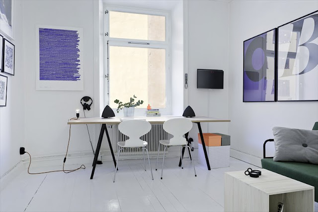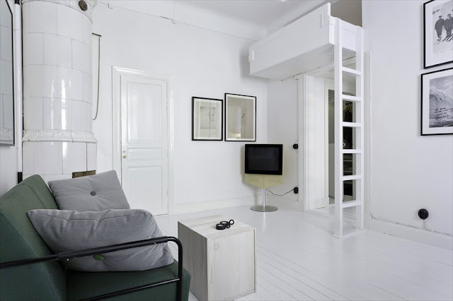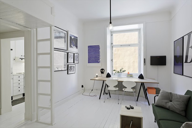 Zieleń – teoretycznie ciężki i nieprzystępny kolor w domowym zaciszu. Jako dodatek, mocny element sprawdza się świetnie. W tym niewielkim mieszkaniu (raptem 29m2) to właśnie kanapa, w odcieniu butelkowej zieleni, gra pierwsze skrzypce. Otacza ją wszechobecna biel, kontrastuje z alfabetycznymi plakatami, niewielkimi grafikami w kolorze szafirowym, nadaje salonowi surowego i minimalistycznego charakteru. Na pierwszy rzut oka mieszkanie nie wygląda na tak małe. Właściciele idealnie wykorzystali dostępną przestrzeń: łóżko umieszczone jest na antresoli, szafa ukrywa się za niepozornymi drzwiami w przedpokoju, miejsce do pracy ulokowano pod samym oknem, a kącik wypoczynkowy obejmuje wcześniej wspomnianą kanapę i mały telewizor. Nowoczesne mieszkanie w przestrzenią wykorzystaną w 100 procentach.