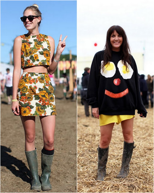 Przewaga Glastonbury nad Coachellą? Swojskość. Tym jednym słowem można scharakteryzować cały festiwal. Pierwszy odbył się tu w 1970 roku i oprócz sporej dawki rockowych brzmień w cenę biletu (1 funta) wliczone było również mleko z pobliskiej farmy. Tylko w 2005 roku na scenie w tym angielskim miasteczku wystąpiło 385 artystów(!) dla 150 000 tysięcznej widowni. Na stronie style.com pojawiły się ostatnio zdjęcia pokazujące co młode Angliki (i nie tylko) wybrały na te wyjątkowe 5 dni. Dominują kalosze hunter’y i look rodem z wiejskiej farmy: kratka, szorty, gdzieniegdzie zobaczycie sukienki, rockowe t-shirty, kwiatki, kurtki oversize..i wianki, czyli idealne zestawy na szalony koncert w ekstremalnych warunkach:)