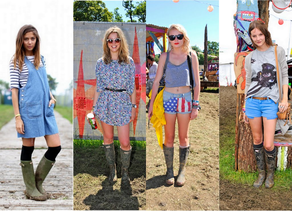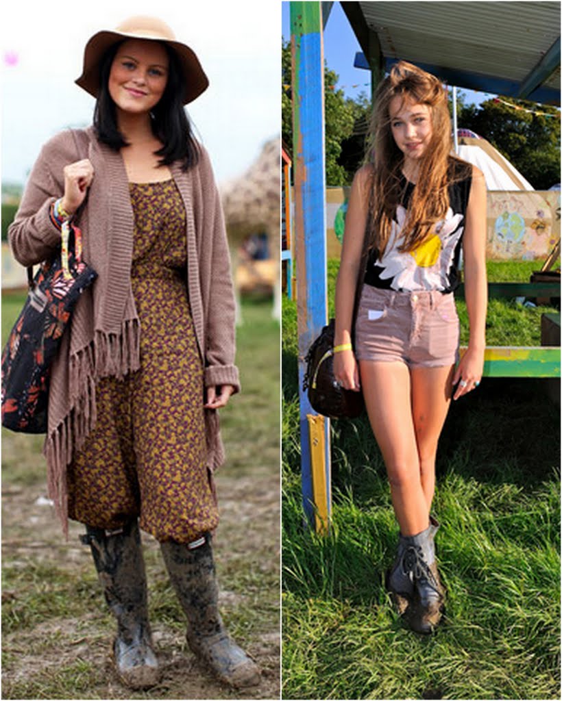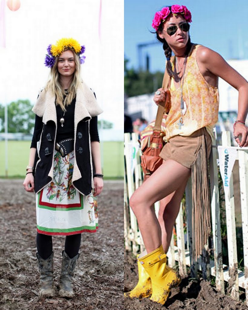 Przewaga Glastonbury nad Coachellą? Swojskość. Tym jednym słowem można scharakteryzować cały festiwal. Pierwszy odbył się tu w 1970 roku i oprócz sporej dawki rockowych brzmień w cenę biletu (1 funta) wliczone było również mleko z pobliskiej farmy. Tylko w 2005 roku na scenie w tym angielskim miasteczku wystąpiło 385 artystów(!) dla 150 000 tysięcznej widowni. Na stronie style.com pojawiły się ostatnio zdjęcia pokazujące co młode Angliki (i nie tylko) wybrały na te wyjątkowe 5 dni. Dominują kalosze hunter’y i look rodem z wiejskiej farmy: kratka, szorty, gdzieniegdzie zobaczycie sukienki, rockowe t-shirty, kwiatki, kurtki oversize..i wianki, czyli idealne zestawy na szalony koncert w ekstremalnych warunkach:)