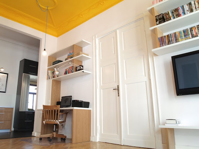 Fajne mieszkanie i boski sufit, ale ta żółć niespecjalnie mi się podoba, pewnie dlatego, że w ogóle nie jestem fanką żółtego koloru:)