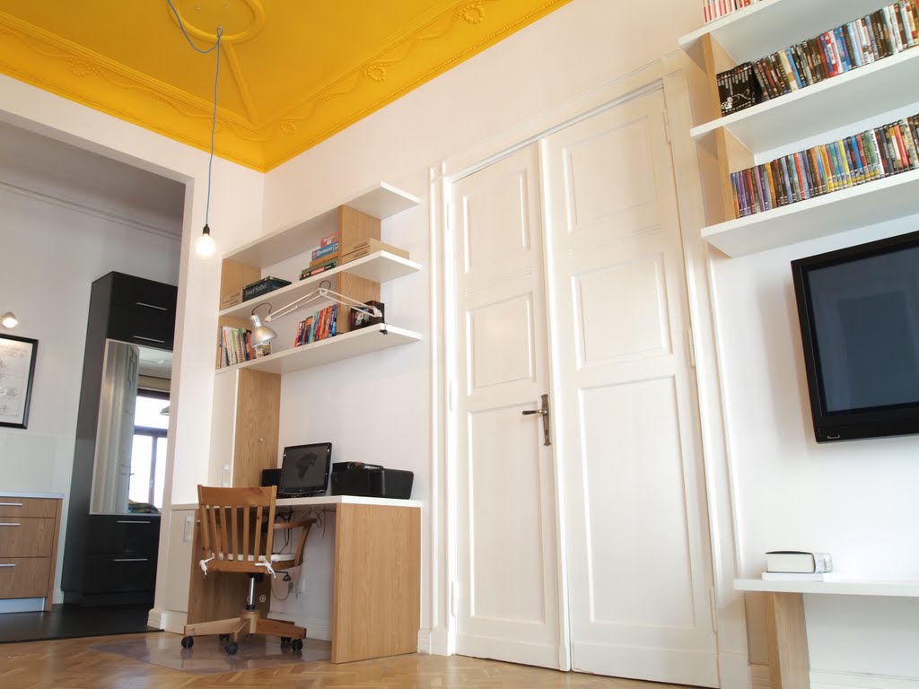 Fajne mieszkanie i boski sufit, ale ta żółć niespecjalnie mi się podoba, pewnie dlatego, że w ogóle nie jestem fanką żółtego koloru:)