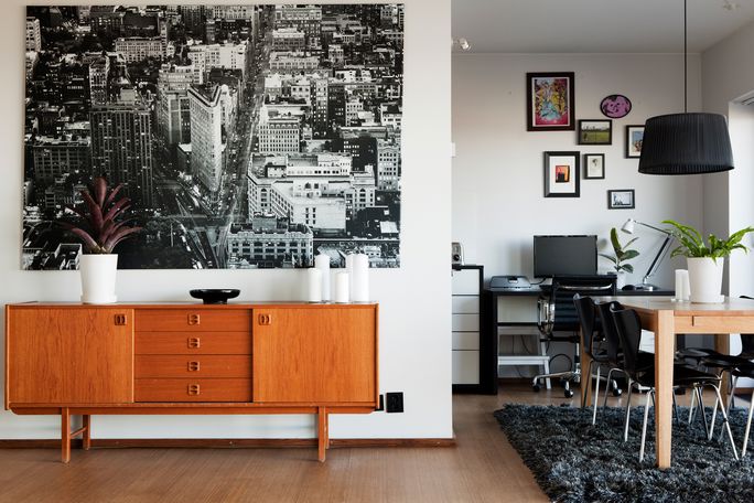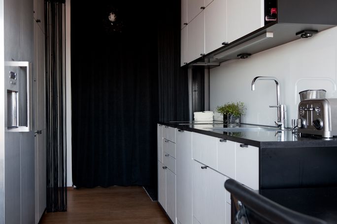 Przyznaję się szczerze, że nie za bardzo przyglądałam się wnętrzu tego mieszkania. Zaintrygowało mnie natomiast to co na zewnątrz. Jest tu wszystko to co kocham najbardziej: duże okna z fantastycznym widokiem na morze, balkon i – jeśli już musimy mówić o tym co w środku – ogromny salon połączony z kuchnią. Znajdziecie tu dwa ogromne kanapo – szezlągi (rzecz jasna białe), i nonszalancko ustawiony z tyłu obraz z Brigitte Bardot, i minimalistyczną kuchnię (też białą z dodatkiem czerni). A co najważniejsze: nawet szwedzka zima nie wydaje się już tak sroga w obliczu tego uroczego widoku zza balkonu. Mało kolorów, dużo przestrzeni – czy trzeba chcieć czegoś więcej?